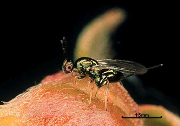Au printemps, lorsque les galles de cynips se forment, les adultes de Torymus sinensis émergent, s'accouplent et les femelles pondent dans les galles de cynips.